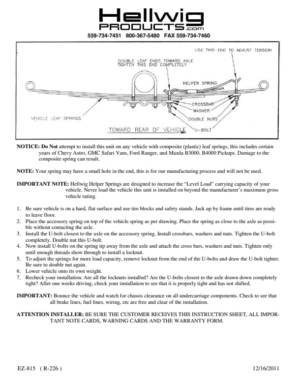 The Hellwig LP-15 helper spring line fits the Mid-size and Small pick-up groups. Manufactured with heat treated ASTM 5160 alloy spring steel in our California based facility, these units increase your vehicles level load carrying capacity up to the manufacturers Gross Vehicle Weight Rating. Featuring heavy duty components and easy to read installation instructions this helper spring line-up does a lot of work for its size. Simple bolt on design using common hand tools provide the installer ease of installation and the vehicle owner hassle free use. Packaged in one kit, this unit comes complete with plated and powder coated components, spring leaves, heavy duty hardware and installation instructions to make this unit easy to install and use. Fine tune your vehicles leaf spring suspension to suit your particular needs by adjusting the heavy duty U-bolts provided. If your tow and haul needs change, simply adjust the heavy duty U-bolts to suit the new requirement. Once installed and adjusted you are free to haul and/or tow a multitude of equipment and commodities with greater control and stability.