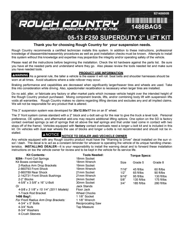 Give your 11-16 Ford Super Duty an impressive upgrade, front to back with Rough Country's 3" Ford Series II Suspension Lift Kit! This easy-to-install lift kit raises the front of your vehicle to be equal height with the rear for a leveled, better-than-stock look that gives an improved ride height and more aggressive appearance. This kit features a set of front, lifted coil springs allowing you gain additional ride height without sacrificing ride quality or performance. A set of radius arm drop brackets as well as a track bar drop bracket are provided to keep everything at optimum angles for a factory-like ride, even after lifting. A set of Rough Country's premium N3 shocks are also included. These fine tuned 10-stage variable high-pressure Nitrogen charged shocks offer a fantastic blend of off-road action and smooth highway ride quality. With a durable 18mm spring-loaded piston rod and faster-cooling 54mm shock body. Get the wheels you want! Rough Country's 3" Series II Suspension Lift Kit comes with everything you need to fit up to a 35" tire with proper wheel backspacing. Best of all, Rough Country's 3" Series II Suspension Lift Kit is backed by our Lifetime Replacement Warranty.